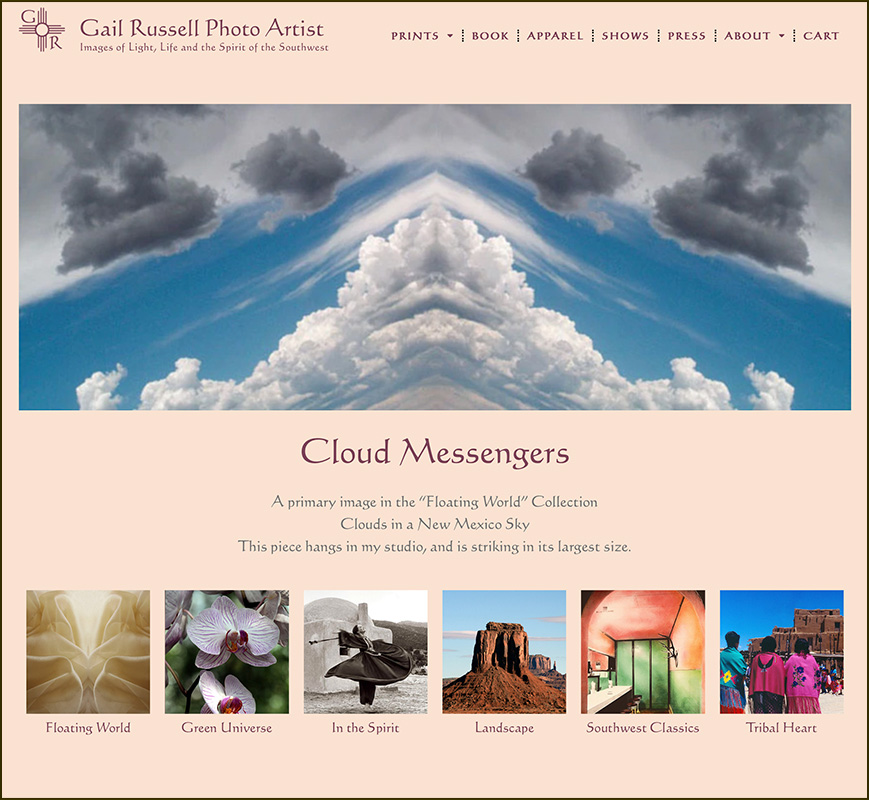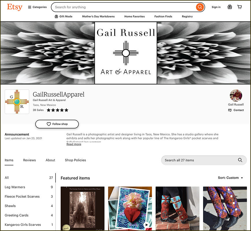 Our style is very much a part of our locale: Taos, New Mexico. We focus on selling Gail Russell’s photographs, photo note cards, Gazelle Shawls, Kangaroo Pocket Scarves, and SallyGators Leg Warmers. The thing that is extraordinary about Gail Russell Art & Apparel is the entire dynamic and value system of her company. Every aspect of her company focuses on connection, community